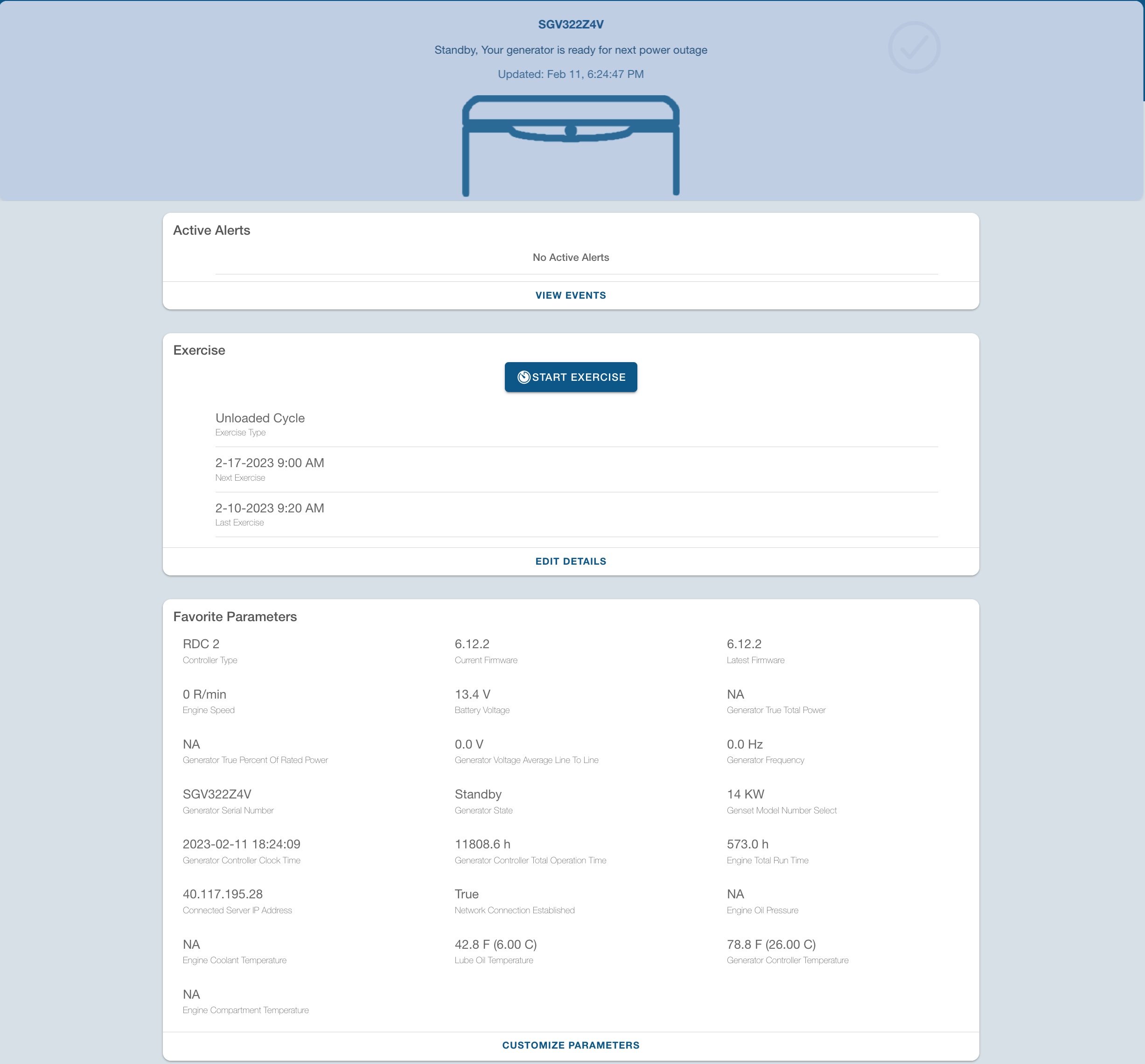 En la página web de On-Cue Plus o en la aplicación se resumen los datos y las informaciones principales tales como número de serie, horas de funcionamiento, temperatura del controlador y del aceite, etc. así como el estado del generador y la indicación de algún fallo o alerta.